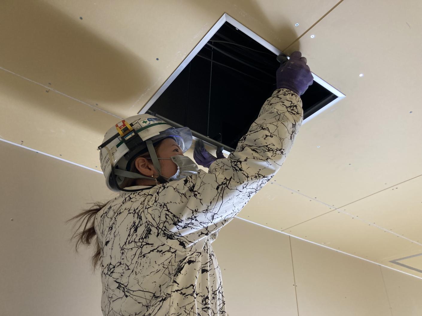 建物の天井や壁に軽量鉄骨(LGS)で骨組みを立て、その上に石膏ボードを張って下地をつくります。大空間を間仕切り、快適な部屋とするための内装工事の第一歩であり、この施工の出来栄えがその後の仕上がりや居住性を左右します。