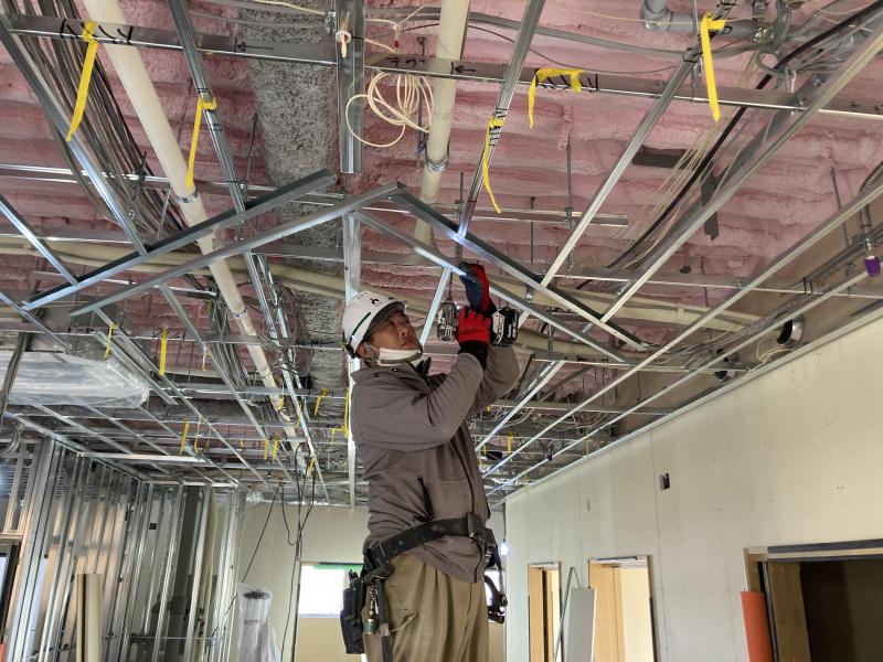 巡回しながら、壁紙やフロア、防水工事などの施工担当箇所について、安全面、品質面、工程面、コスト面で問題がないか確認し、必要に応じて職人さんに指示を出します。