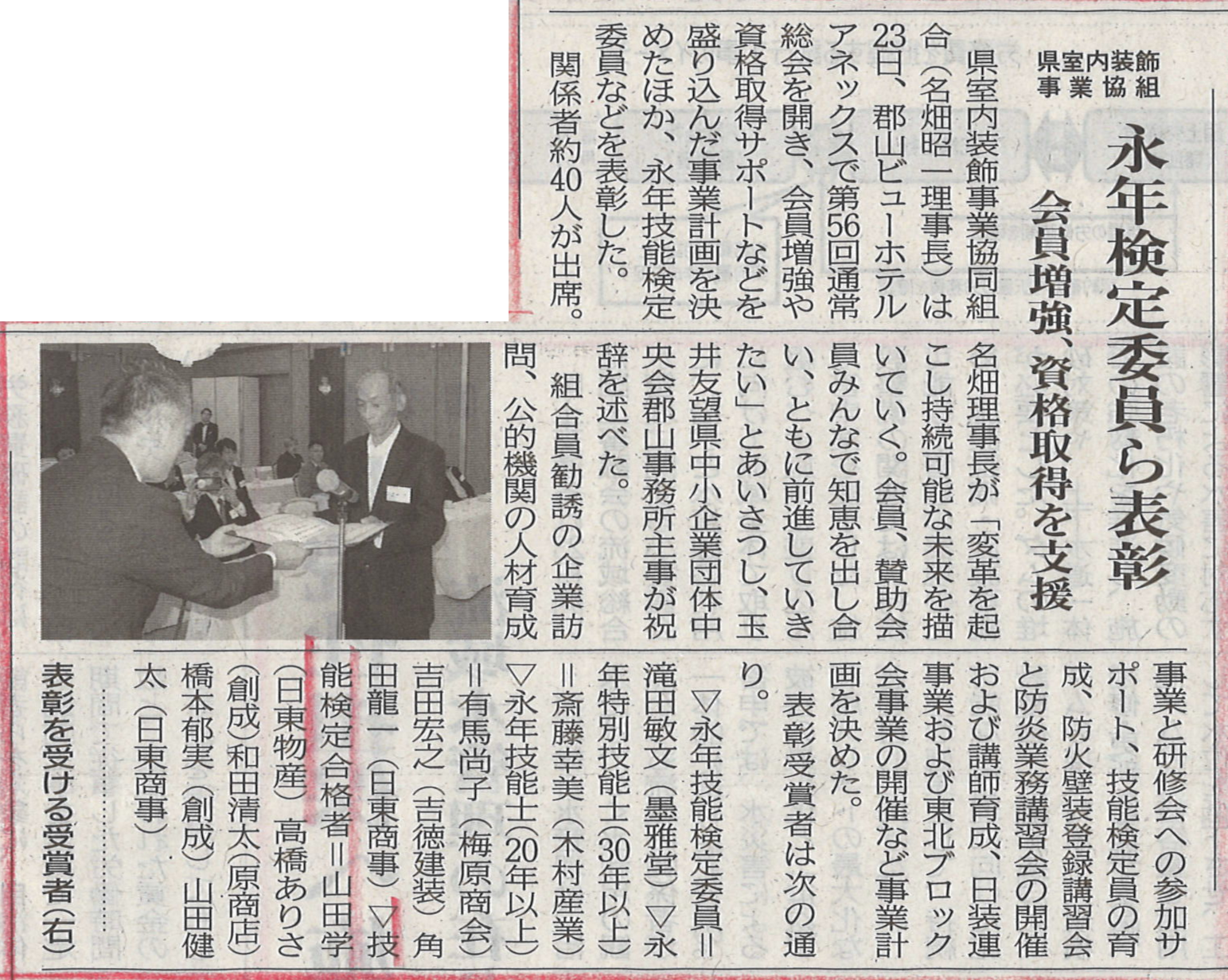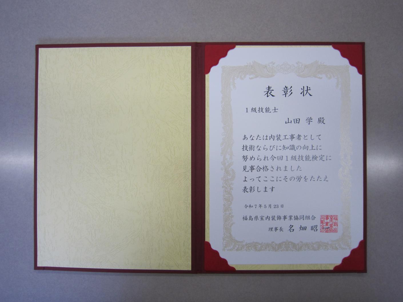 県室内装飾事業協同組合第56回通常総会において、当社の山田学さんが内装仕上げ工1級の技能検定合格により表彰されました。