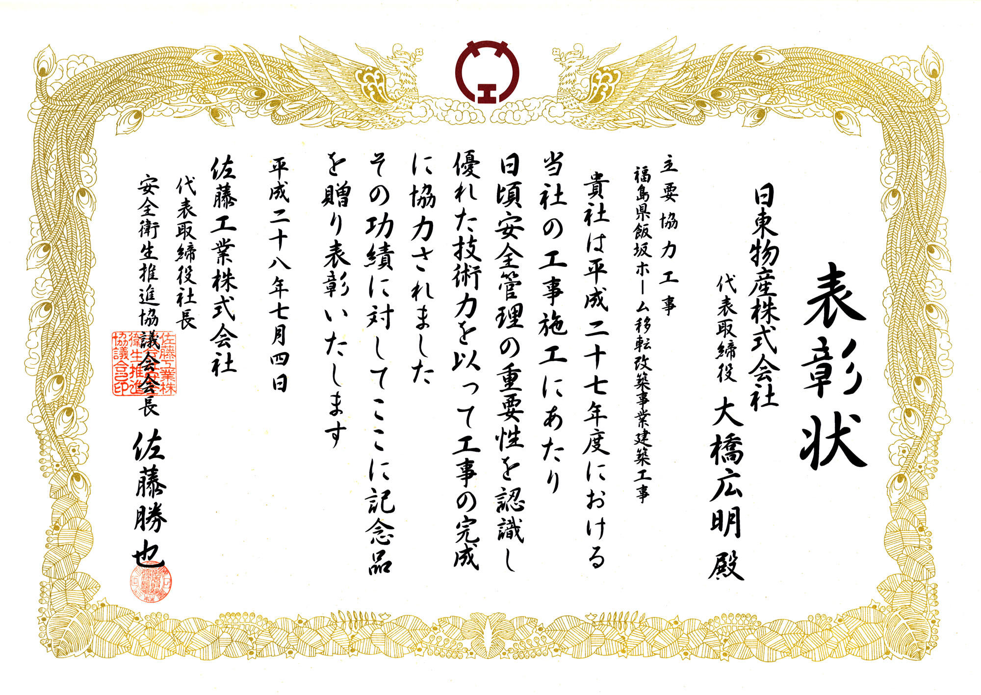 佐藤工業様より表彰されました。