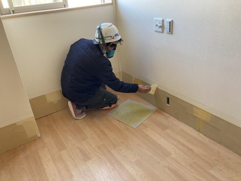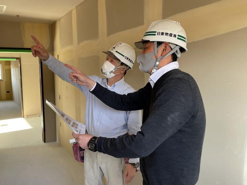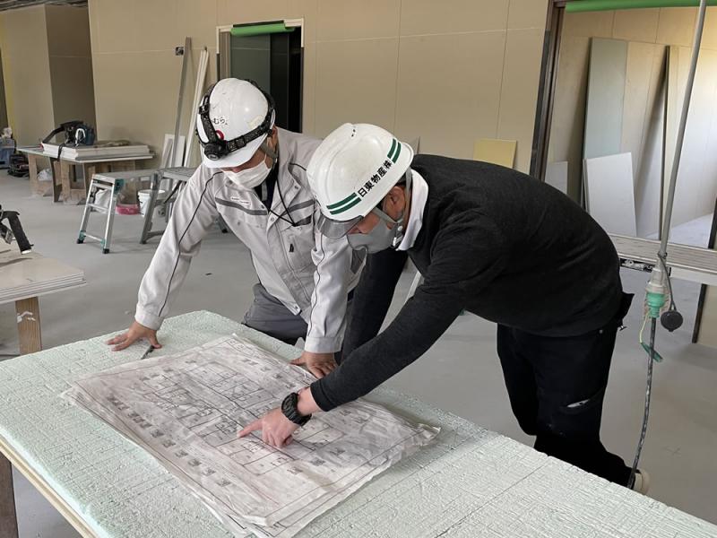 巡回しながら、壁紙やフロア、防水工事などの施工担当箇所について、安全面、品質面、工程面、コスト面で問題がないか確認し、必要に応じて職人さんに指示を出します。