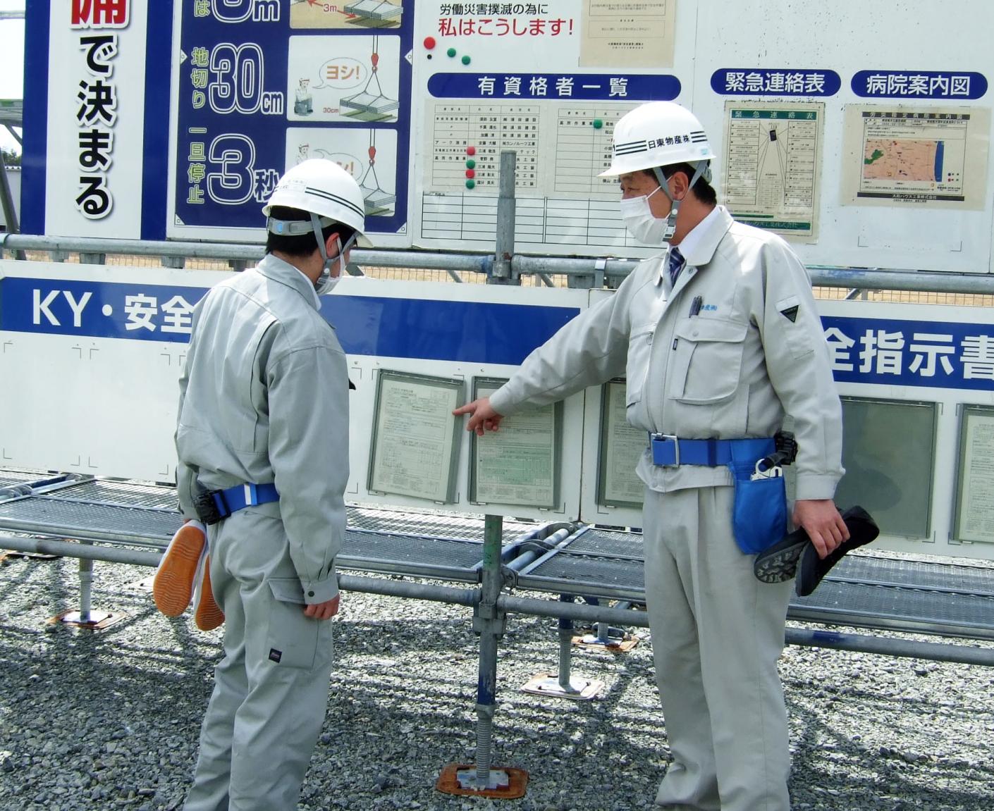 現場巡回。安全と品質、工程の管理を徹底し、定期的にパトロールも。