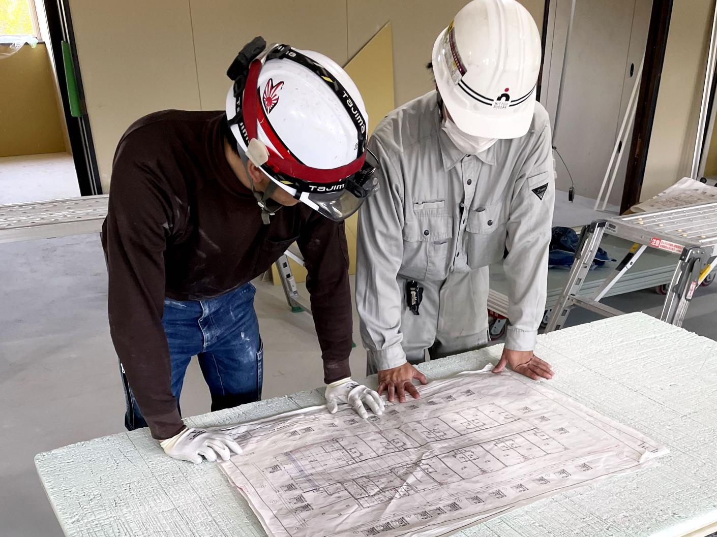 おもに大手ゼネコンから請け負った案件について、日東物産専属の約100名の職人さんたちをマネジメントしながら施工現場管理者として仕事を進めます。
