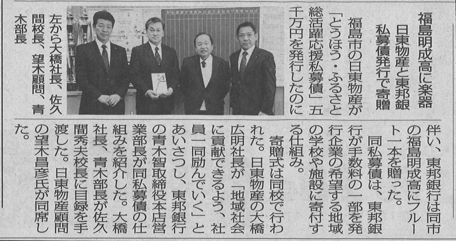 東邦銀行様が引き受け先となって、今回3回目となる私募債の発行に伴い、記念品として福島明成高校にフルートを寄贈しました。同校校長室で寄贈式を行い、大橋社長が「これからも地域社会に貢献できる企業であるよう、社員一同励んでいく」とあいさつしました。