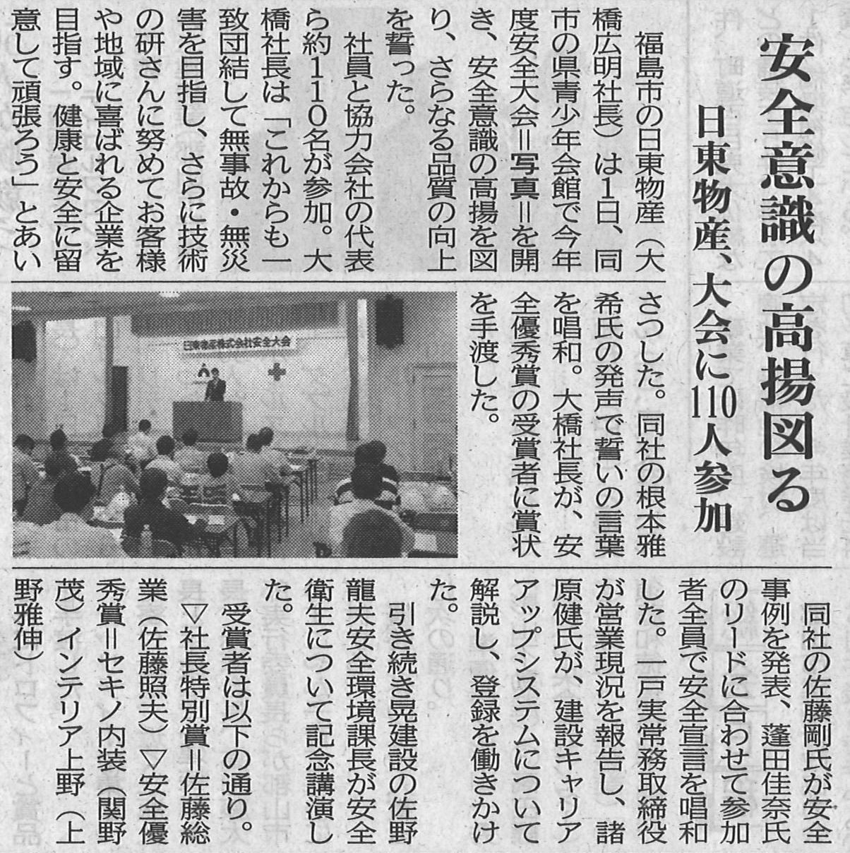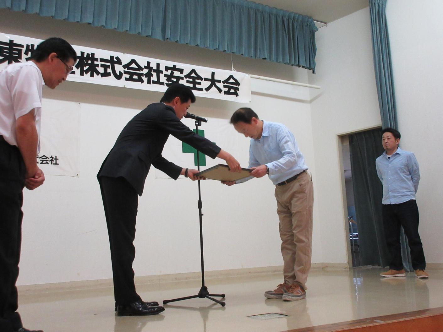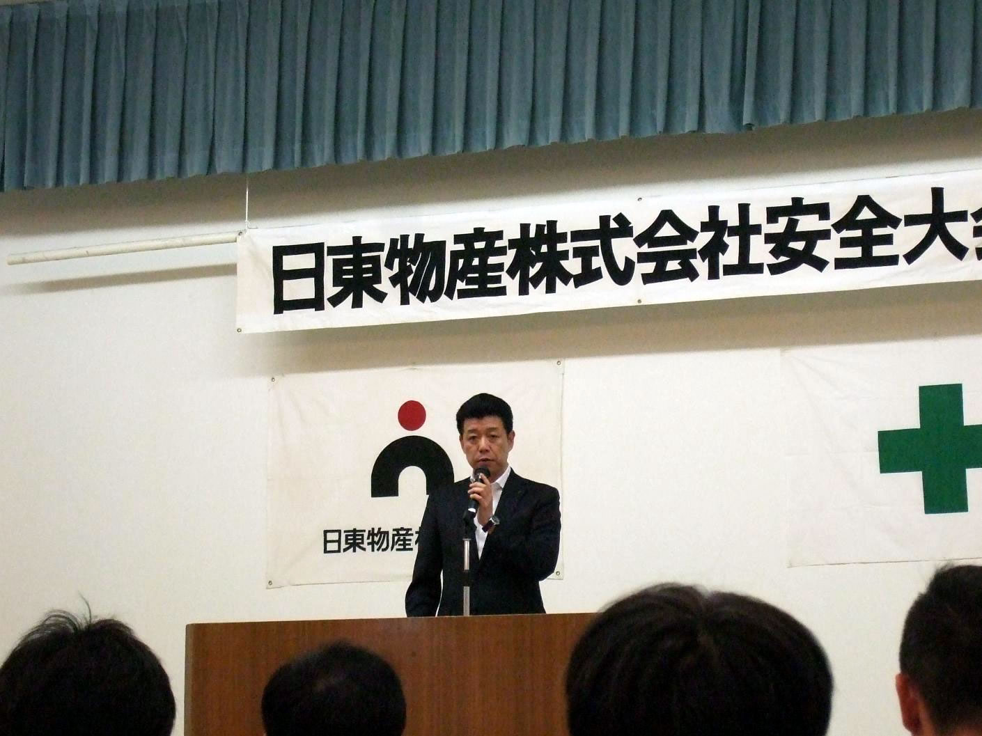 社員、協力会社から約110人が参加。大橋社長が「無事故・無災害を達成できたのも、現場で働く皆さんのおかげ。これからも家族のために健康と安全に留意して仕事に取り組み、さらなる技術の研さんに努めて、お客様や地域の方々に喜んでいただける企業を目指していこう」とあいさつし、参加者全員で快適な職場づくり、より高い安全衛生水準の向上を目指し、自主的に安全管理を徹底することを誓いました。