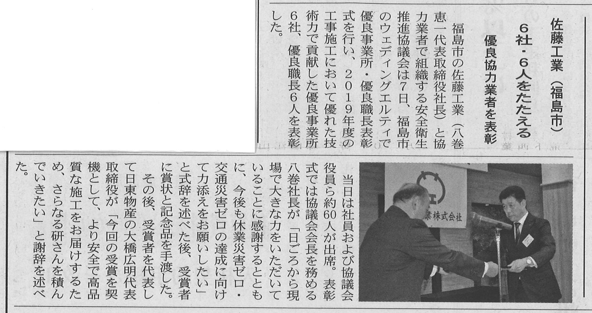 佐藤工業株式会社様より表彰
