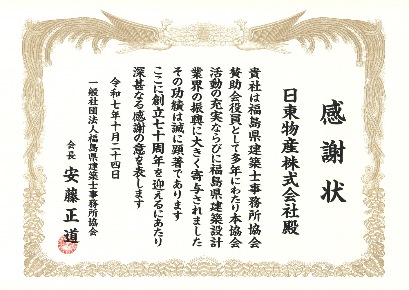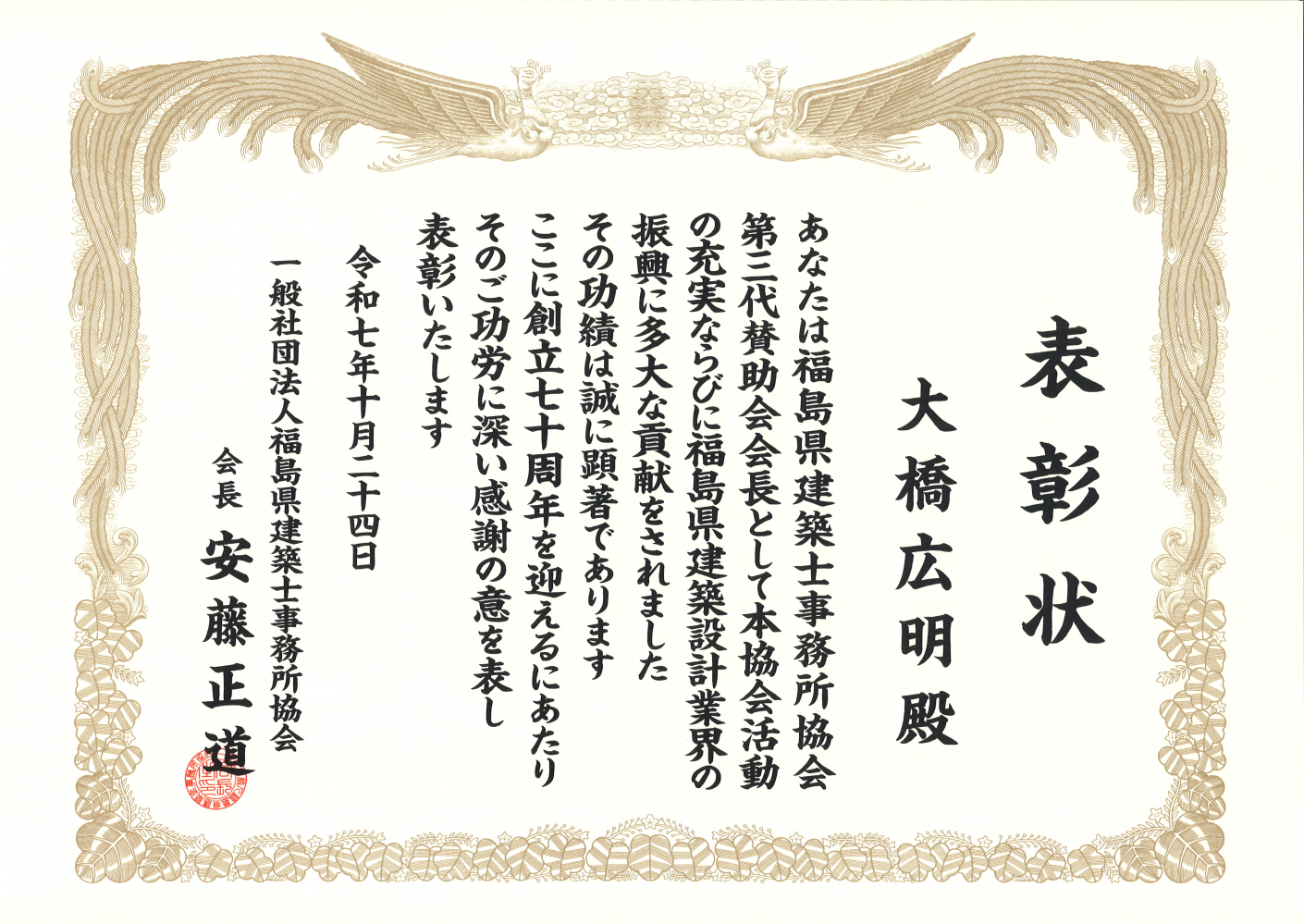 県建築士事務所協会創立70周年の式典が10月24日に開催され、弊社社長が賛助会会長を3期6年務め、功労者表彰を授与されました。また会社としても、役員を18年務めたことに対し、感謝状をいただきました。
